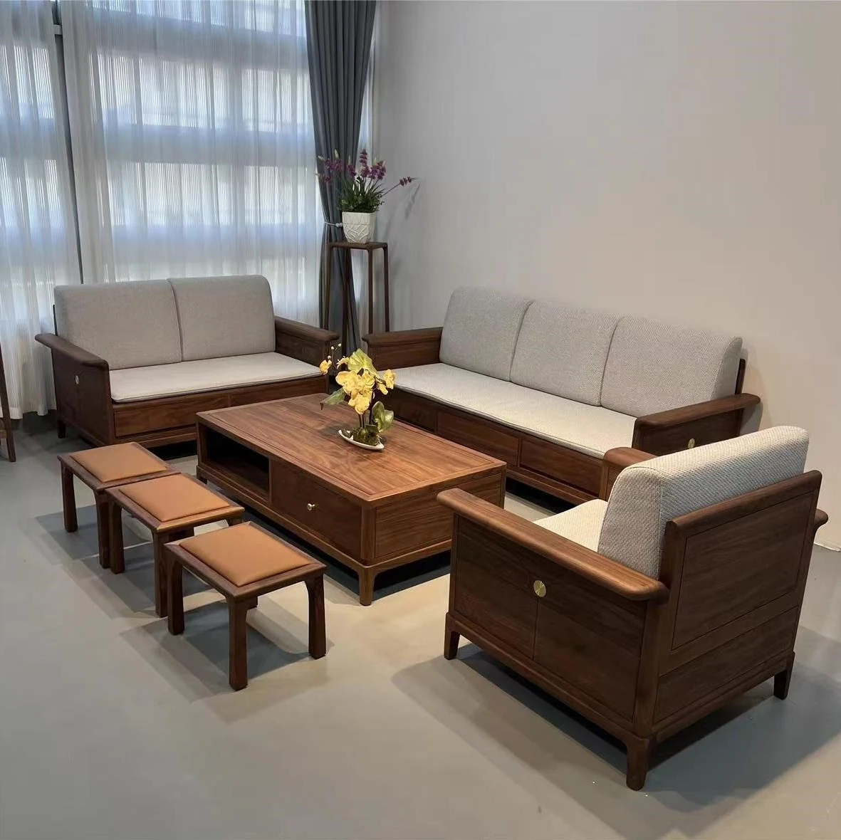 New Chinese Zen Style Solid Wood Sofa and Coffee Table Set in North American Black Walnut and Ash for Office, Hotel, and Airbnb Decor