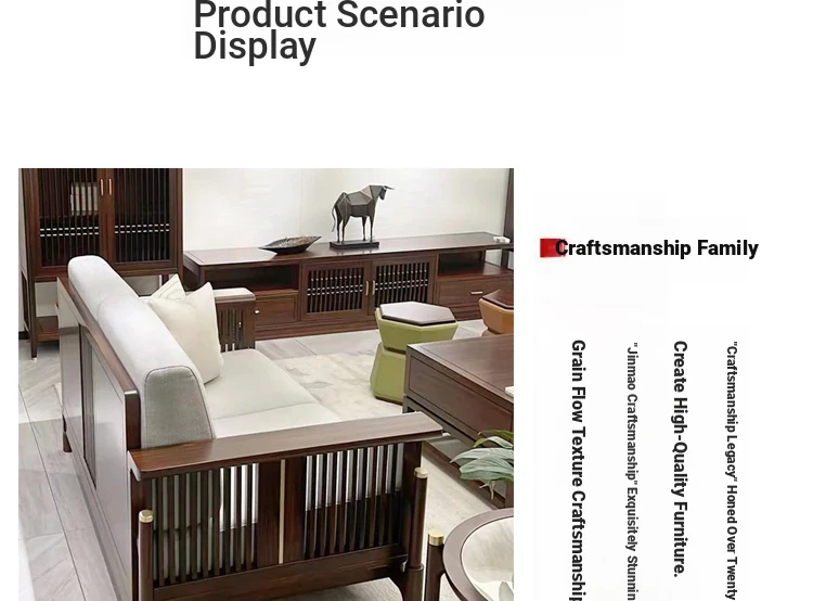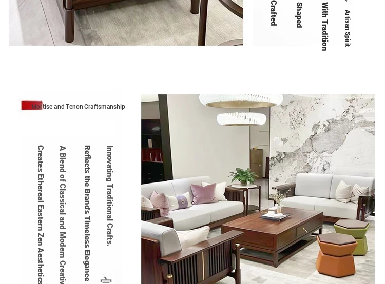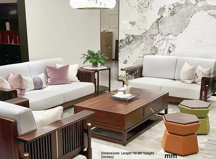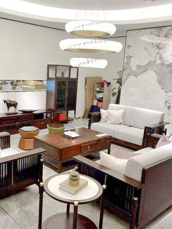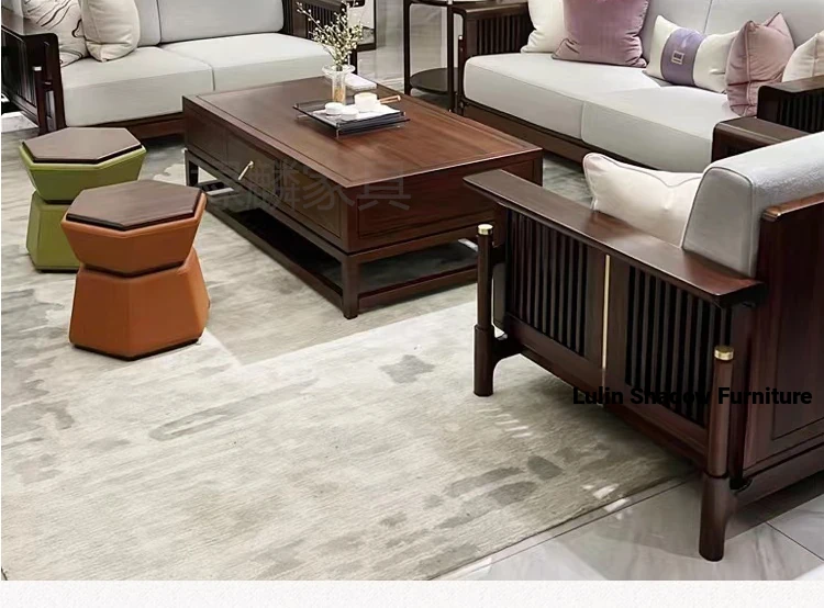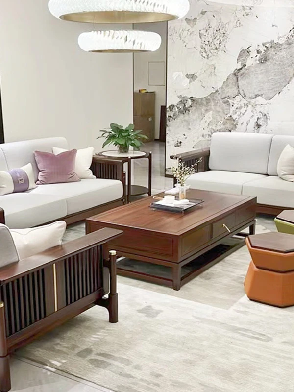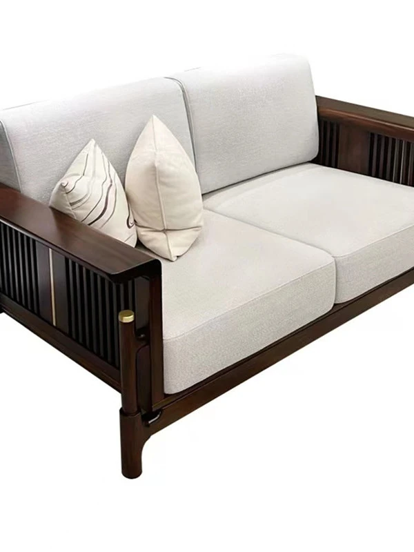 Modern Chinese Style Sofa - Light Luxury Solid Wood Furniture for Small Spaces, Zen-Inspired Fabric Sofa in Wenge Wood for Sample Room, Living Room, and Villa.