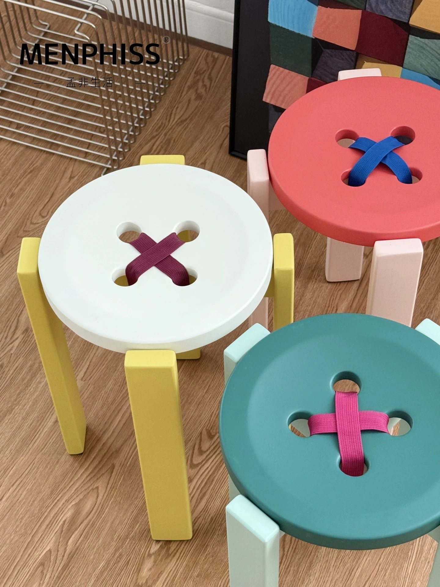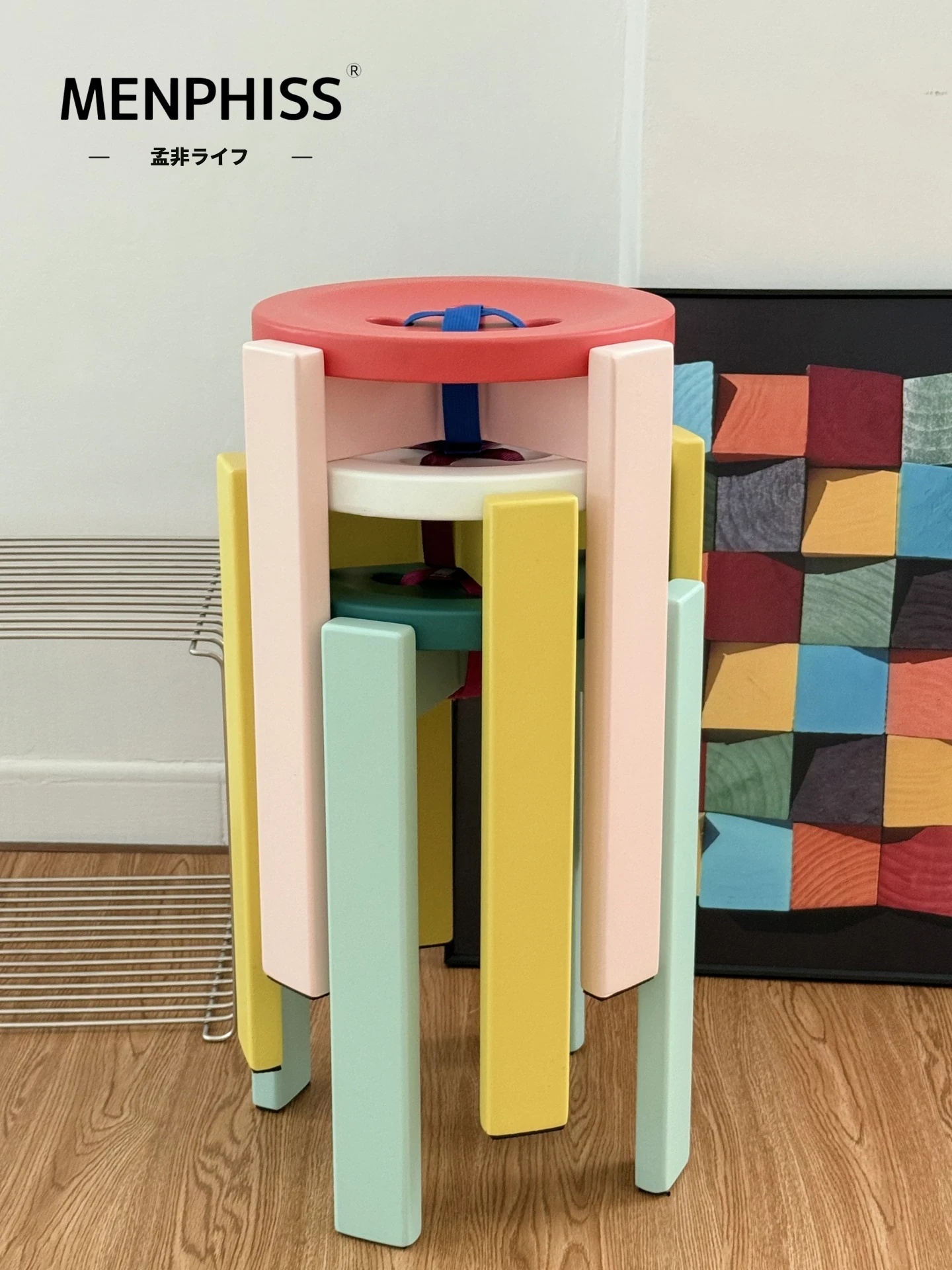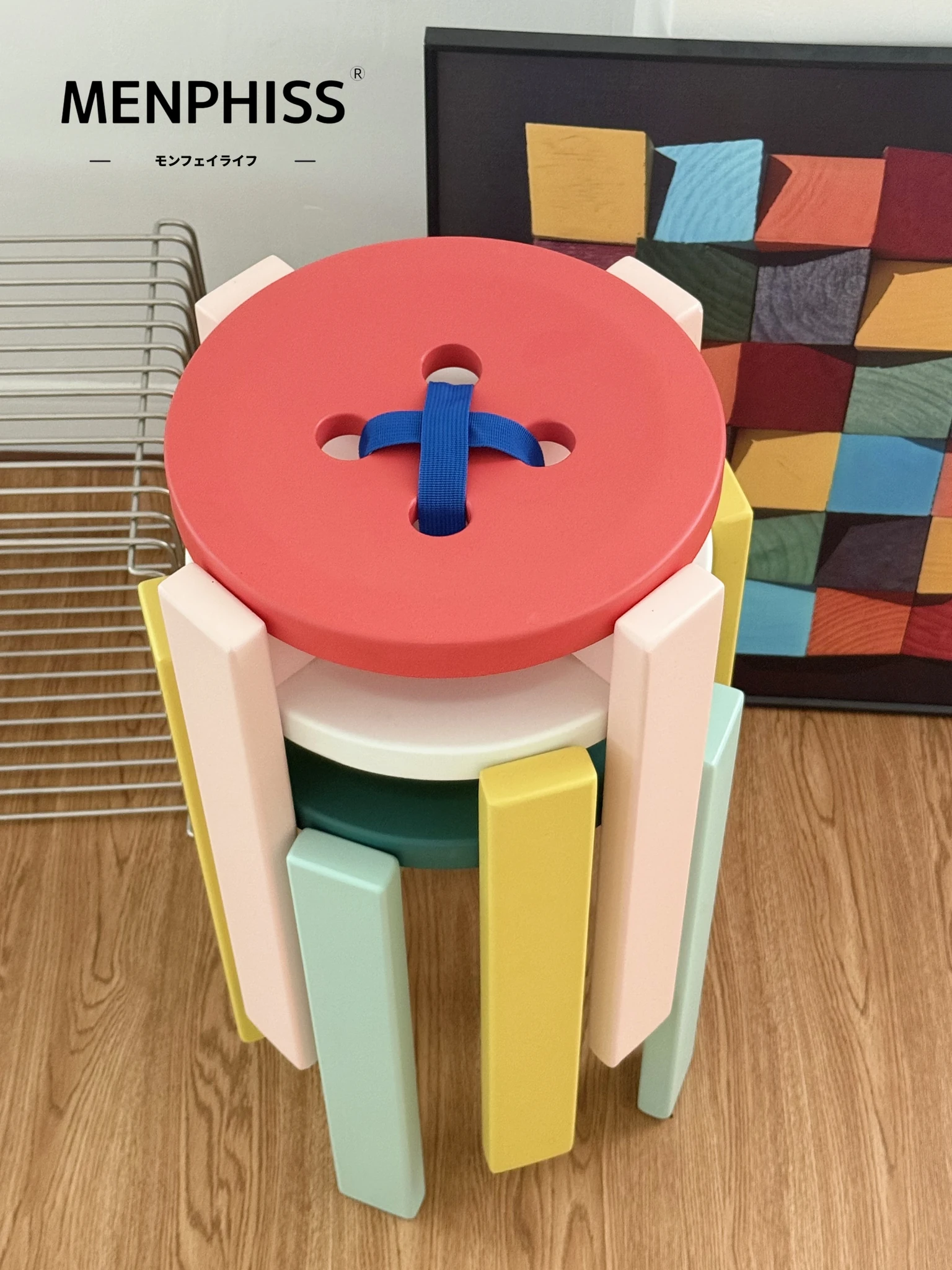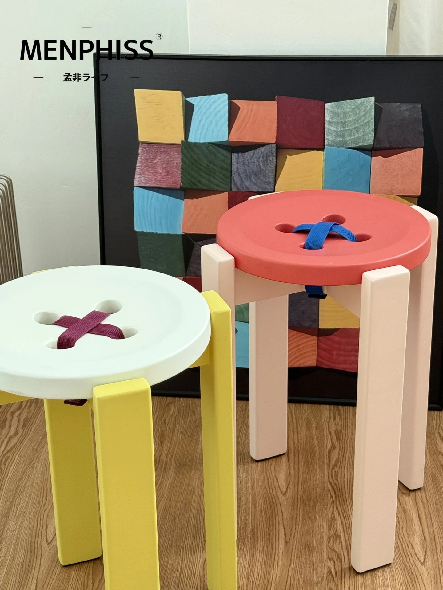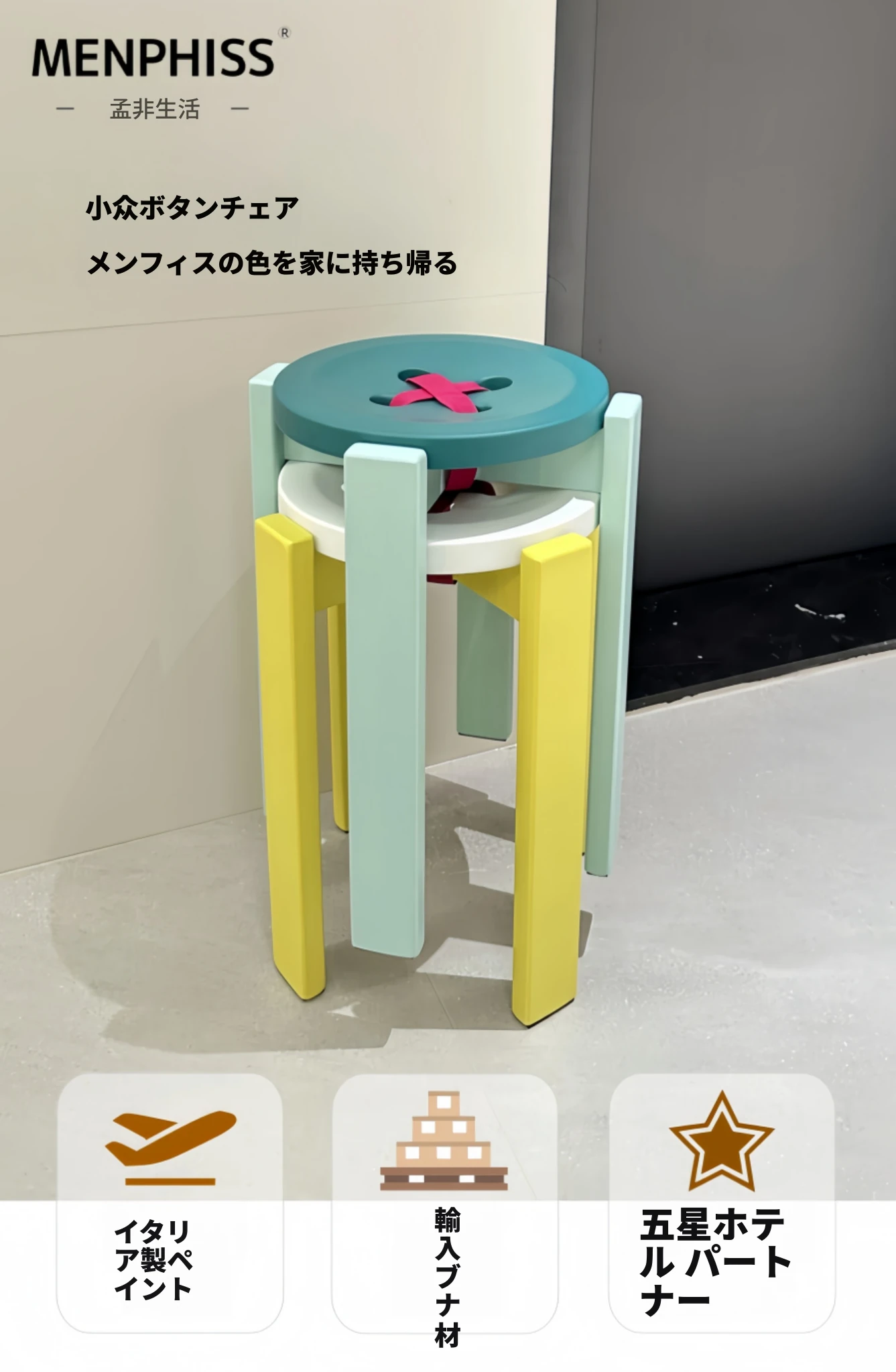孟非デザインの木製クリエイティブボタンスツール - スタッキング可能な多用途ダイニングチェア!おしゃれで実用的なインテリアアイテム、あなたの生活空間を明るく彩ります。