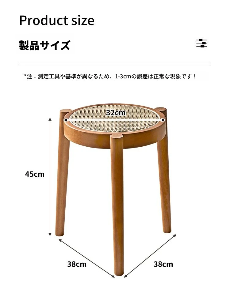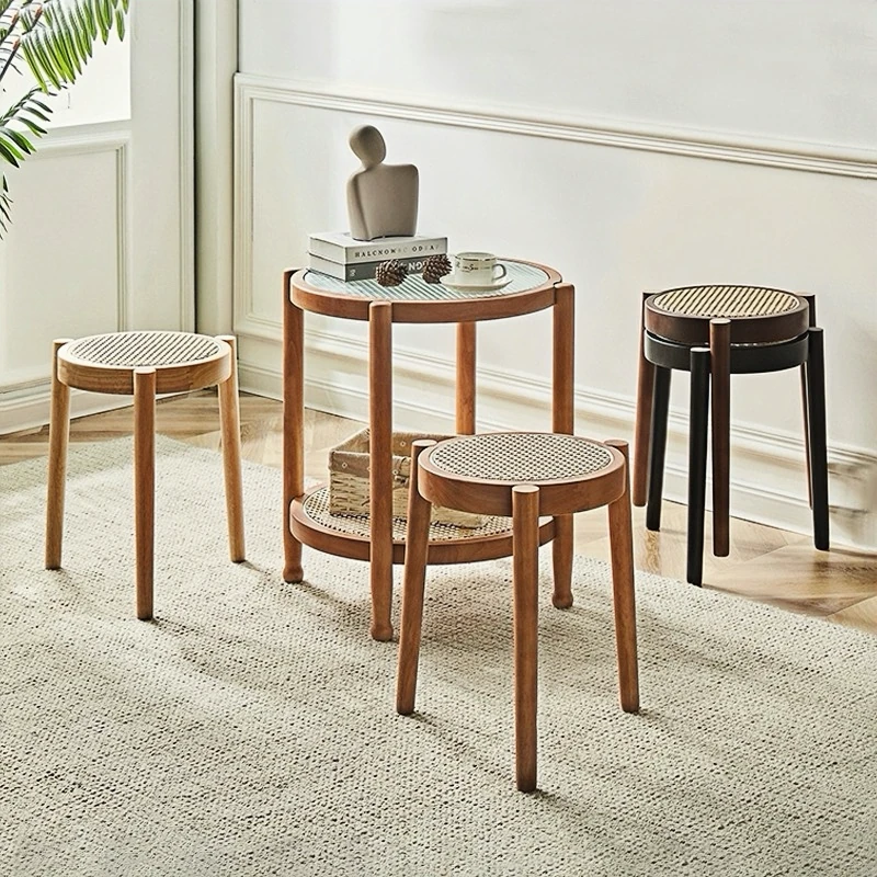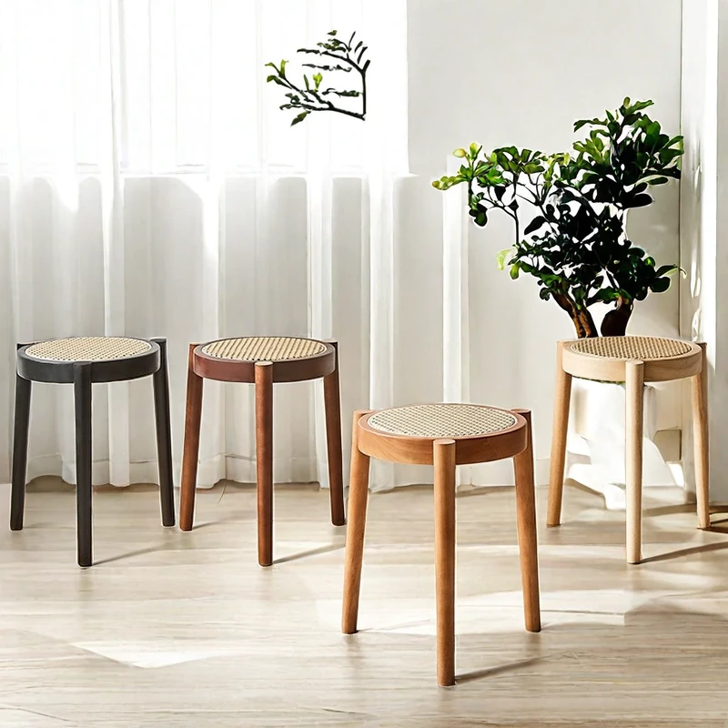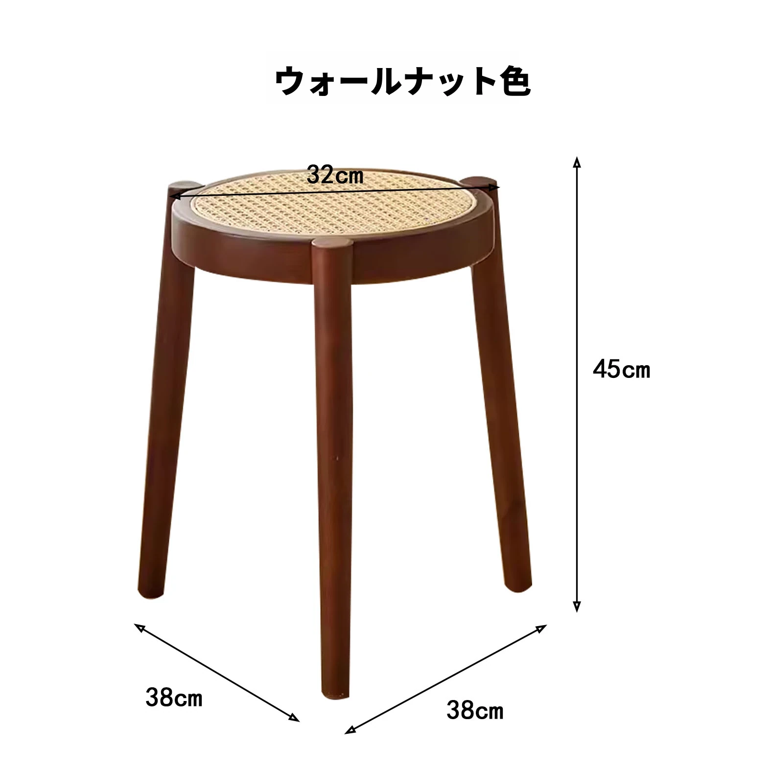 北欧風の天然木とラタン編みスツール|スタッカブルで便利!リビングやダイニングに最適なミニラウンドスツール|シンプルなデザインで化粧台やカジュアルな休憩にもぴったり!