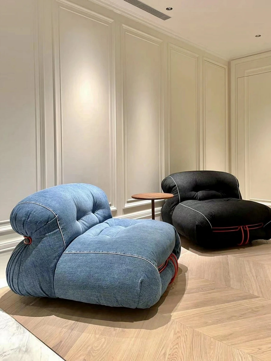 孟非デザインの中古一人掛けソファ、ユニークなヒッポスタイルのスチールフレーム、バウハウス風デニム生地使用。おしゃれなリビングにぴったり!快適さとスタイルを兼ね備えた一品です。